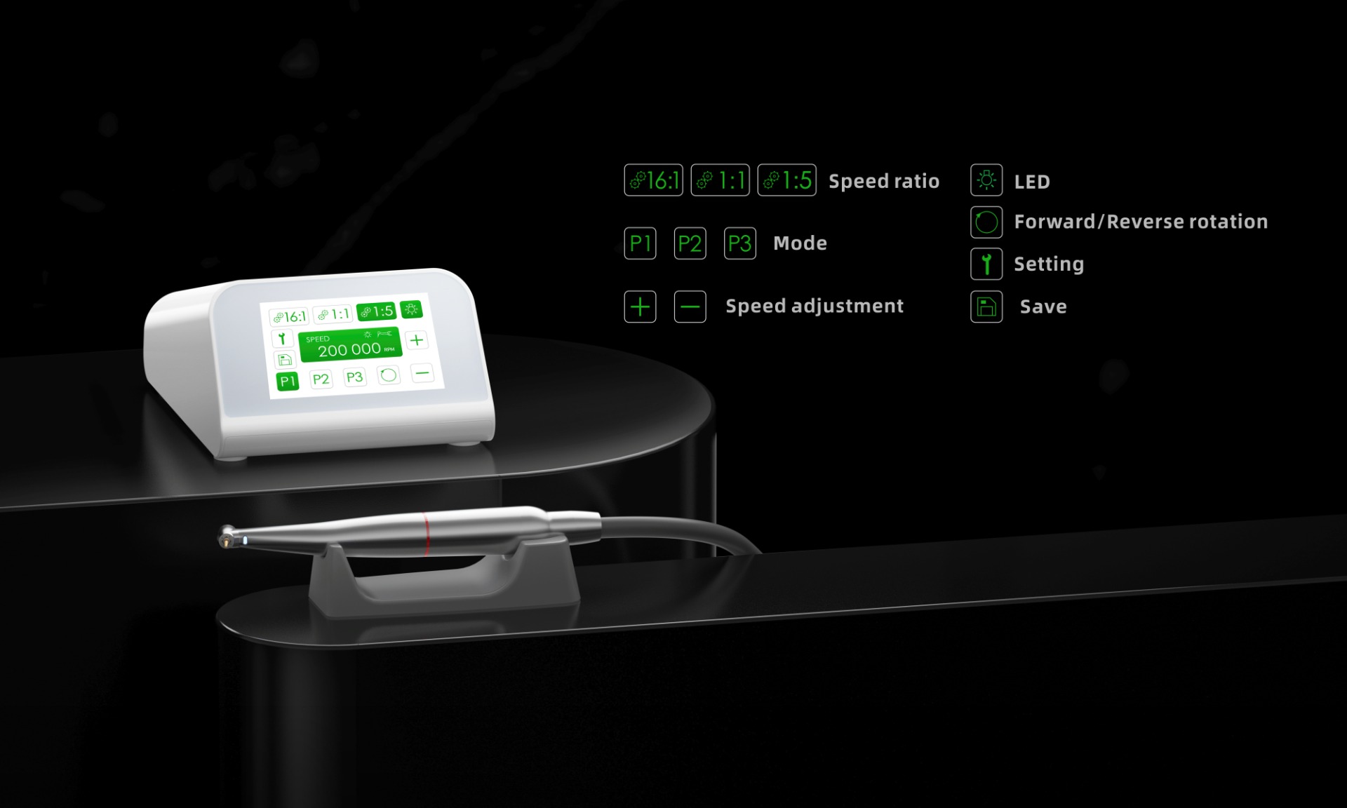 Maximálna kontrola: LCD displej zobrazuje všetky nastavenia a otáčky, ktoré s násadcom 1:5 dosahujú až 200 000 rpm.