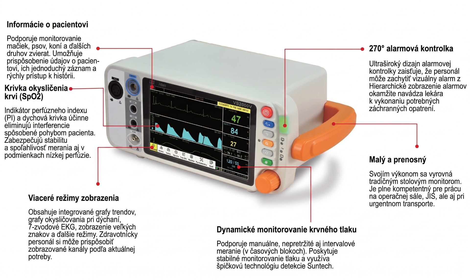 Monitor vitálnych funkcií VS2000V je navrhnutý pre maximálnu flexibilitu v teréne aj na klinike. Je určený pre široké spektrum pacientov – od mačiek až po kone. Vďaka praktickej rukoväti a nízkej hmotnosti (len 2,05 kg) je tento 7-palcový monitor ideálnym spoločníkom pre veterinárnu záchrannú službu a mobilnú prax.